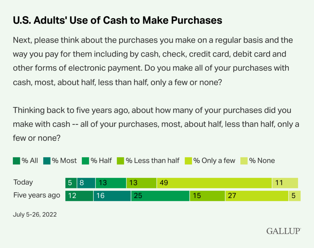 Obr. č. 2: Použitie hotovosti dospelými američanmi na nákupy 2022 a 2015 (zdroj: GALLUP)