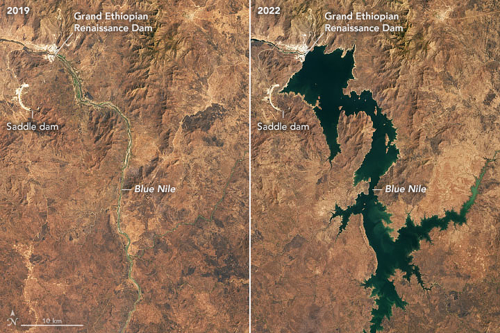 Novovzniknutá vodná nádrž na Modrom Níle (zdroj: Lauren Dauphin, NASA Earth Observatory)