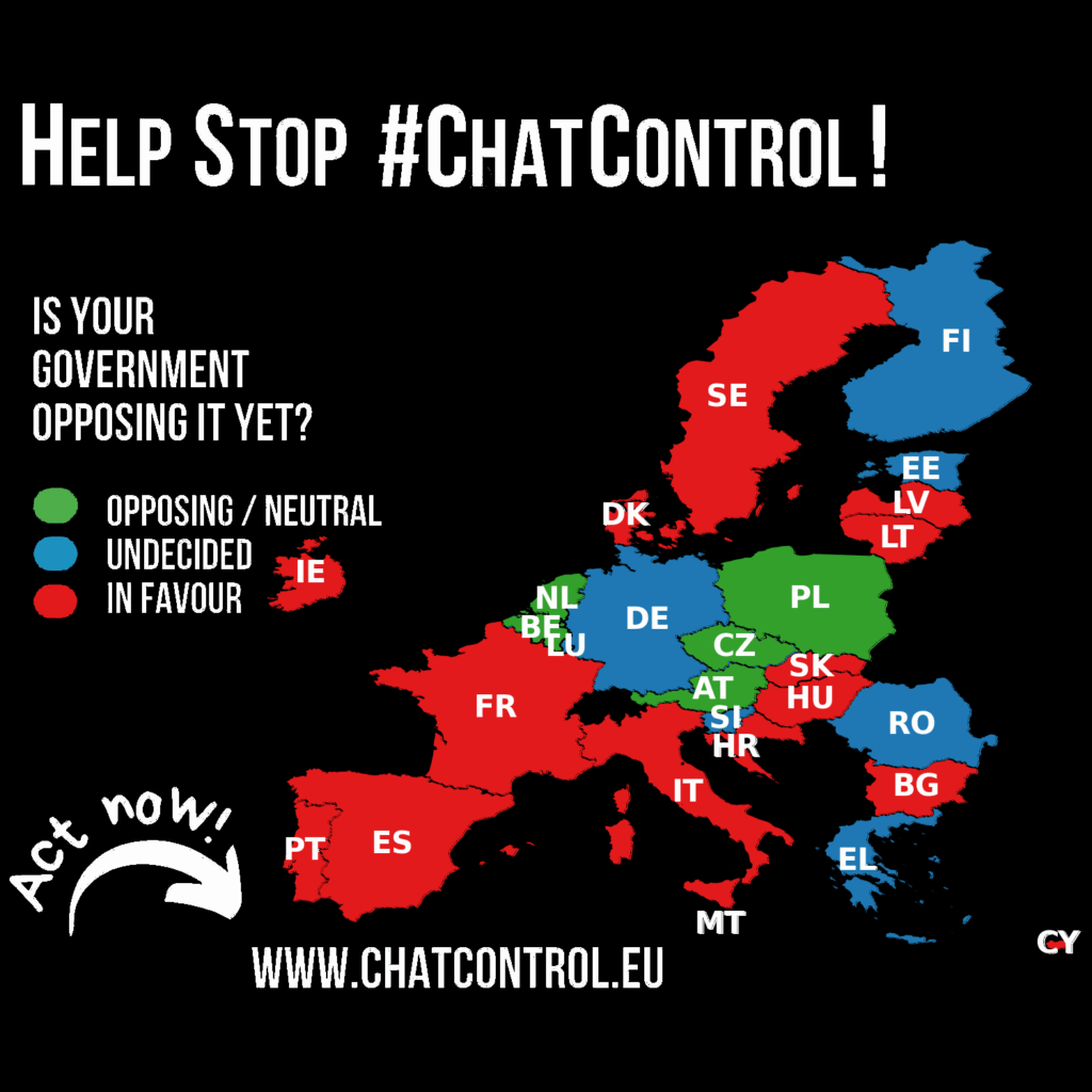V minulosti tzv. povinný Chat Control na úrovni EÚ neprešiel, teraz sa však prejednáva nový návrh dánskeho predsedníctva EÚ. Cieľom návrhu je boj proti sexuálnemu zneužívaniu detí tým, že by služby elektronickej komunikácie boli povinné umožňovať celoplošnú analýzu súkromných správ, vrátane tzv. end-to-end šifrovanej komunikácie. Predstava je taká, že by umelá inteligencia analyzovala obsah súkromných správ používateľov chatových a e-mailových služieb a vyhodnocovala potenciálne hrozby, ktoré by niekto následne „ručne“ spracoval.