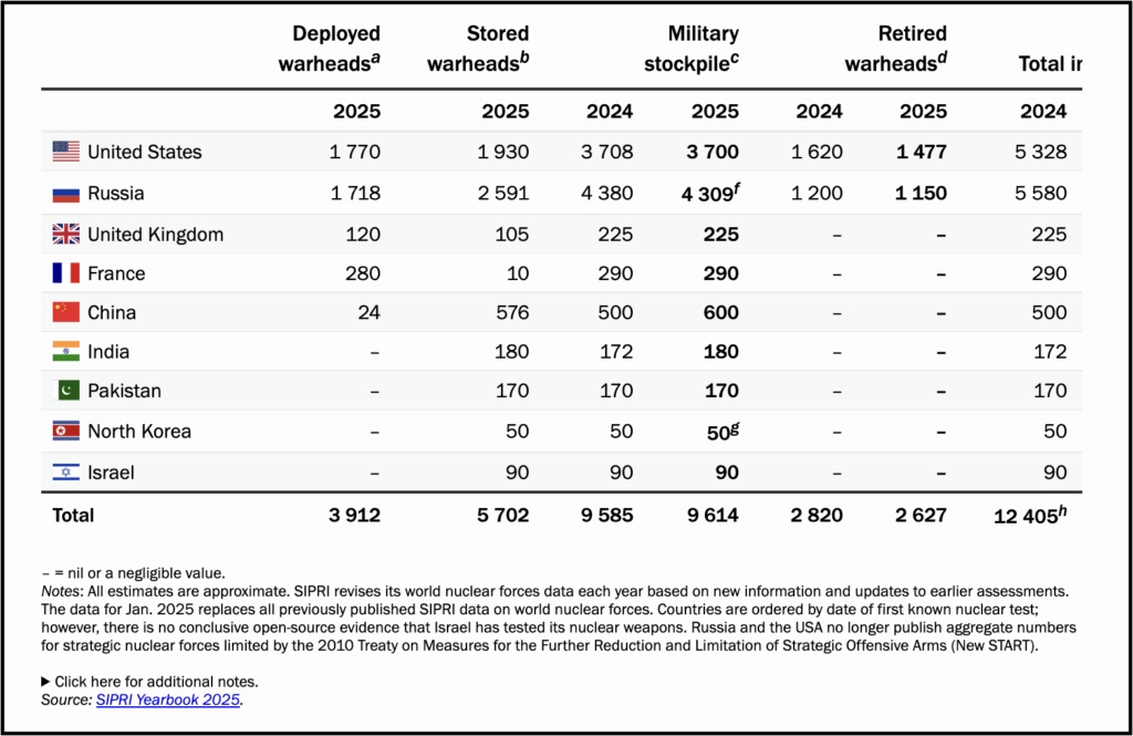Obr. č.1: Jadrové zbrane vo svete – január 2025 (zdroj: SIPRI)