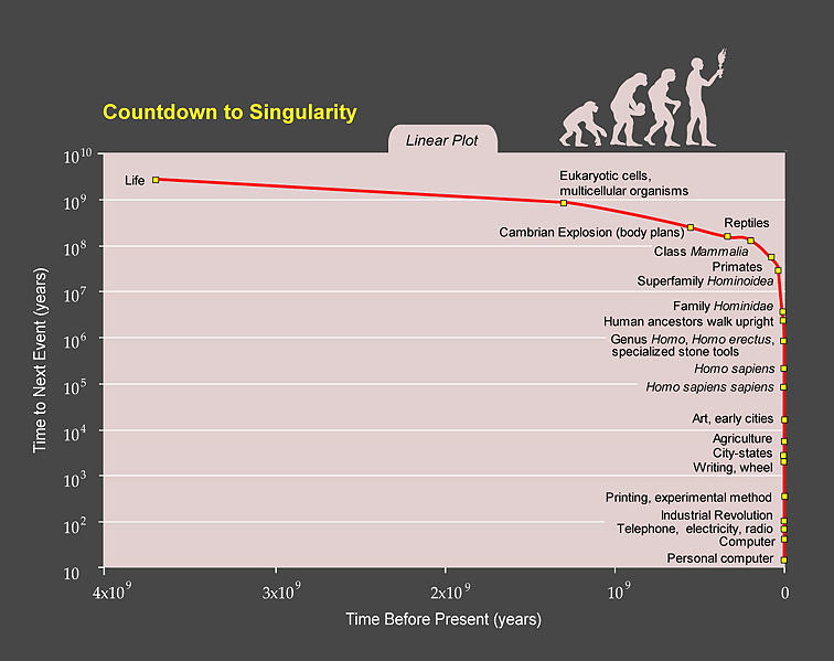 Známy počítačový vedec a futurista R. Kurzweil spopularizoval myšlienku singularity ľudského (vesmírneho vývoja), kedy zostavil graf najväčších míľnikov v biologickom a neskôr vedecko-technickom vývoji v grafe č.3, kde na osi x je čas do dosiahnutia singularity a os y je časový rozdiel medzi jednotlivými míľnikmi, čím popísal aj makroevolučnú krivku vesmíru v spojitosti s biologickým a vedecko-technickým pokrokom.