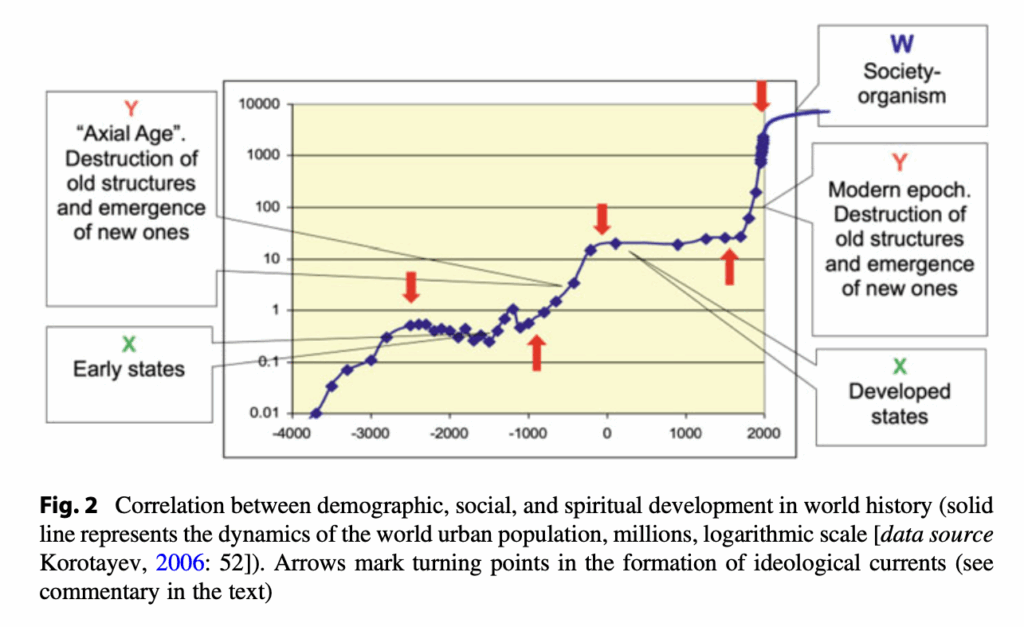 Podobné obdobie z hľadiska viacerých trendov nastalo pred zhruba 2000 rokmi, kedy vtedajšie civilizácie, najlepšie historicky preštudovaná – Rímska ríša dosiahla limity svojho rozmachu a prešla do obdobia stagnácie, rovnako nastala aj klimatická zmena, kedy na viac ako 1000 rokov ochladla zem, čo spôsobilo aj nátlak na Rímsku ríšu presúvajúcich sa národov zo severu. Dynamiku dlhodobého vývoja ľudskej civilizácie dobre zobrazujú trendy meniacej sa mestskej populácie planéty, čo je zobrazené na obrázku č. 6, kde je na osi x časový úsek od 4000 p.n.l. po 2000 n.l. a na osi y je počet obyvateľov miest v miliónoch na logaritmickej škále.
