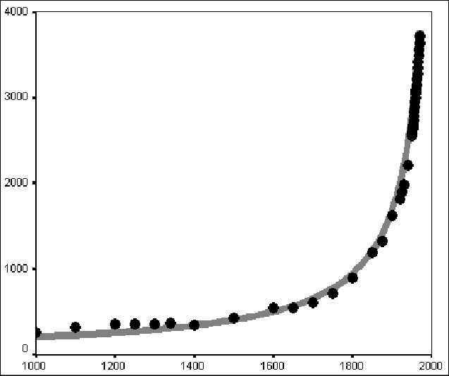 Obr. č.1: Korelácia medzi empirickými odhadmi svetovej populácie (čierna, v miliónoch ľudí, 1000 – 1970) a krivkou vytvorenou rovnicou von Foerstera et al. (sivá) (zdroj: Grinin et al, 2015)